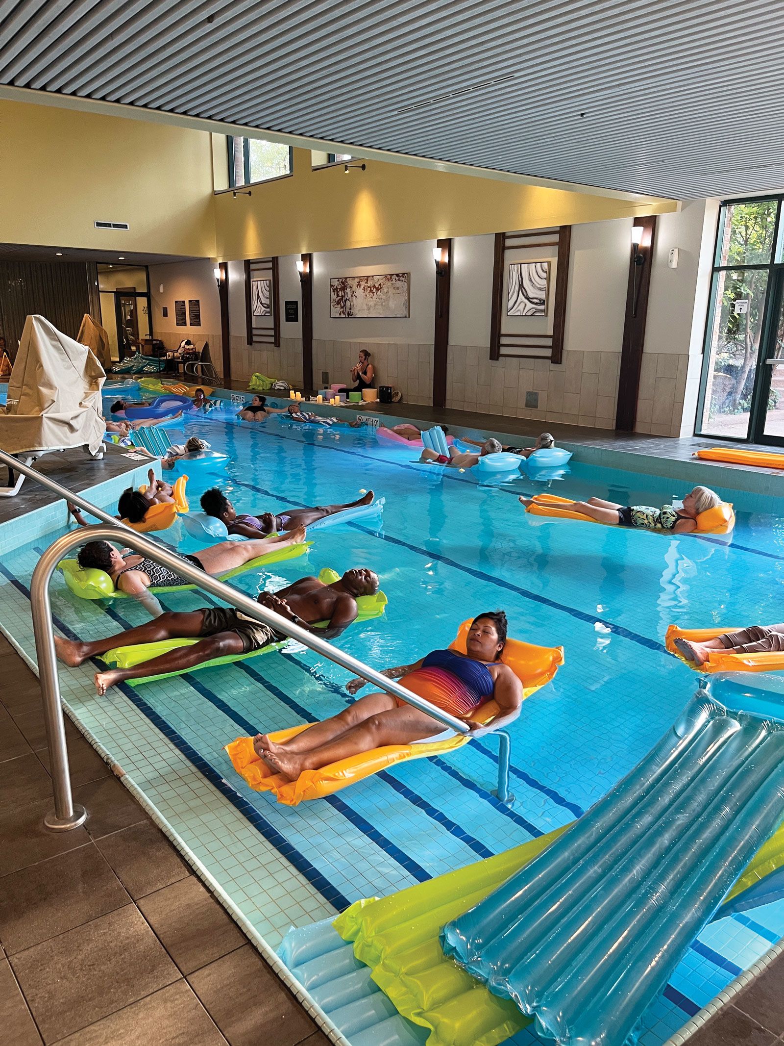 A group floats in a pool during a sound bath experience at The Inverness Denver. (Courtesy of The Inverness Denver)