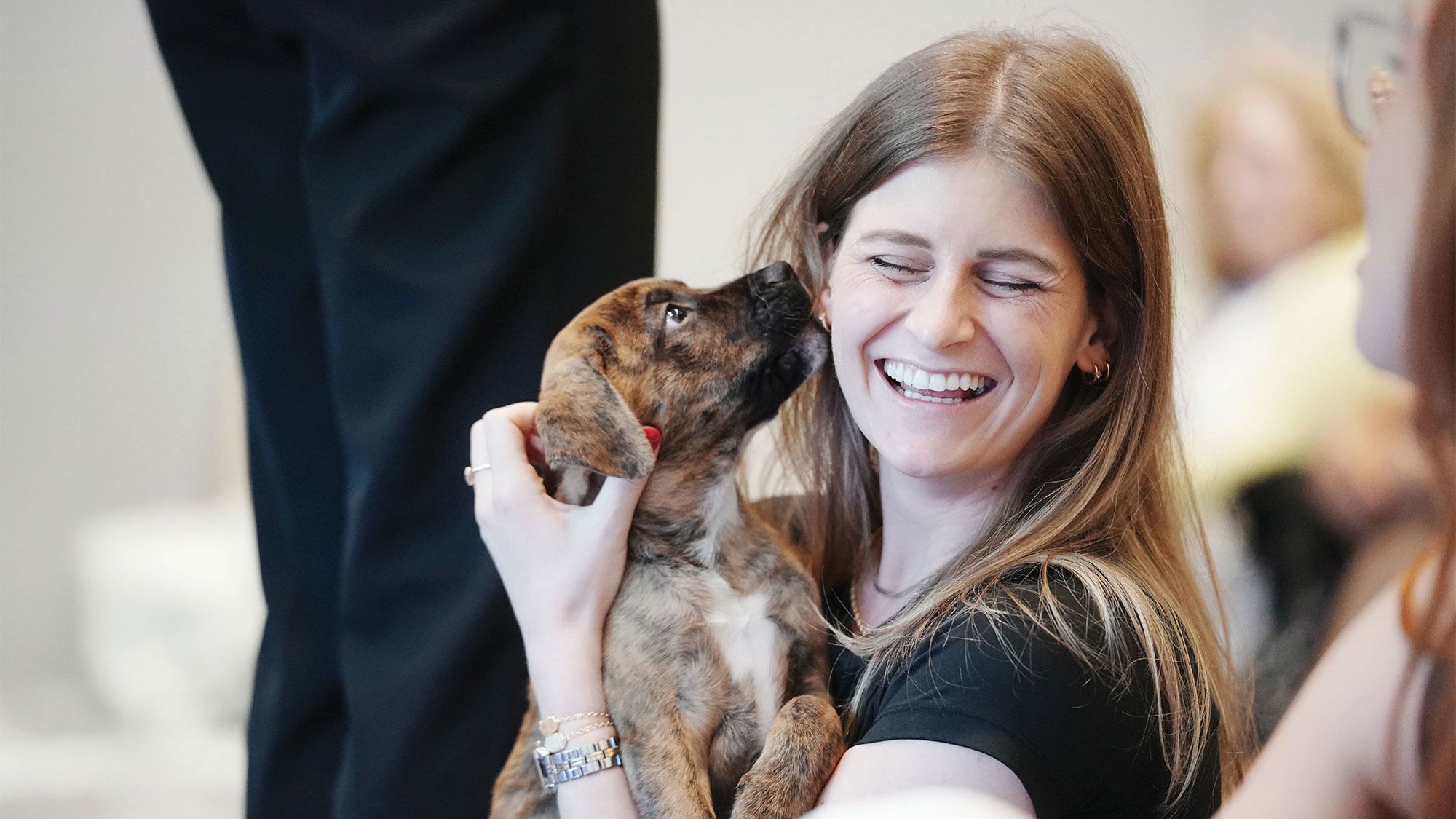 An attendee participates in puppy yoga during the annual Cvent Connect conference for event professionals, marketers and hospitality experts. (Courtesy of Cvent)